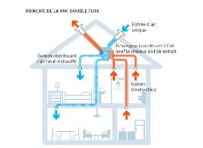 La VMC double flux avec récupération de chaleur, intéressante pour des logements bien isolés Ce système peut récupérer la chaleur de l’air vicié extrait de la maison et l’utiliser pour réchauffer l’air venant de l’extérieur.